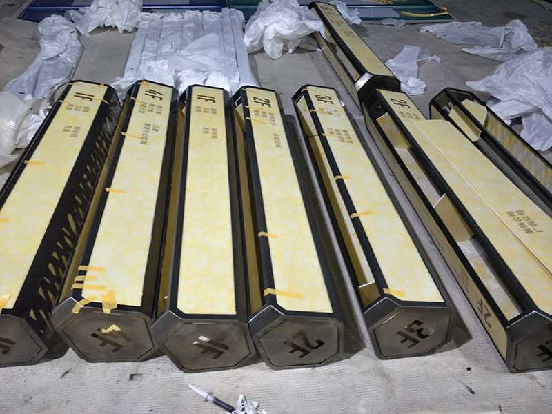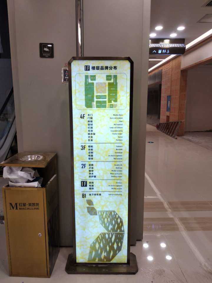 本批次產(chǎn)品均由不銹鋼折彎焊接成型, 表面采用電鍍上色,吊牌內(nèi)容鏤空,內(nèi)襯亞克力,LED發(fā)光。整體從內(nèi)部機(jī)構(gòu)到外表造型及顏色均滿足紅星美凱龍總部要求的VI標(biāo)準(zhǔn),與商場(chǎng)環(huán)境和風(fēng)格相互融合,滿足導(dǎo)視功能的同時(shí)融入環(huán)境,增強(qiáng)視覺(jué)美感。